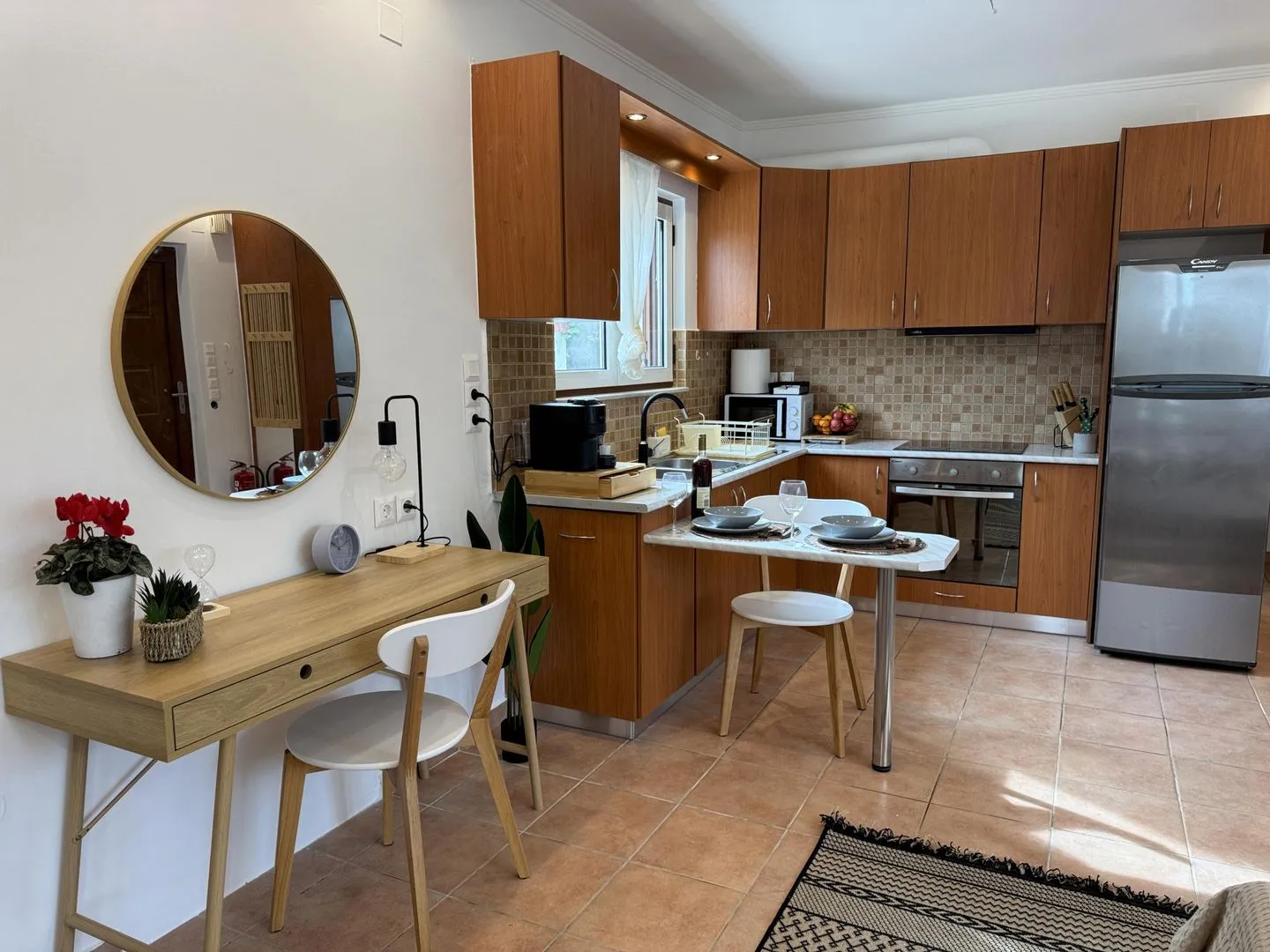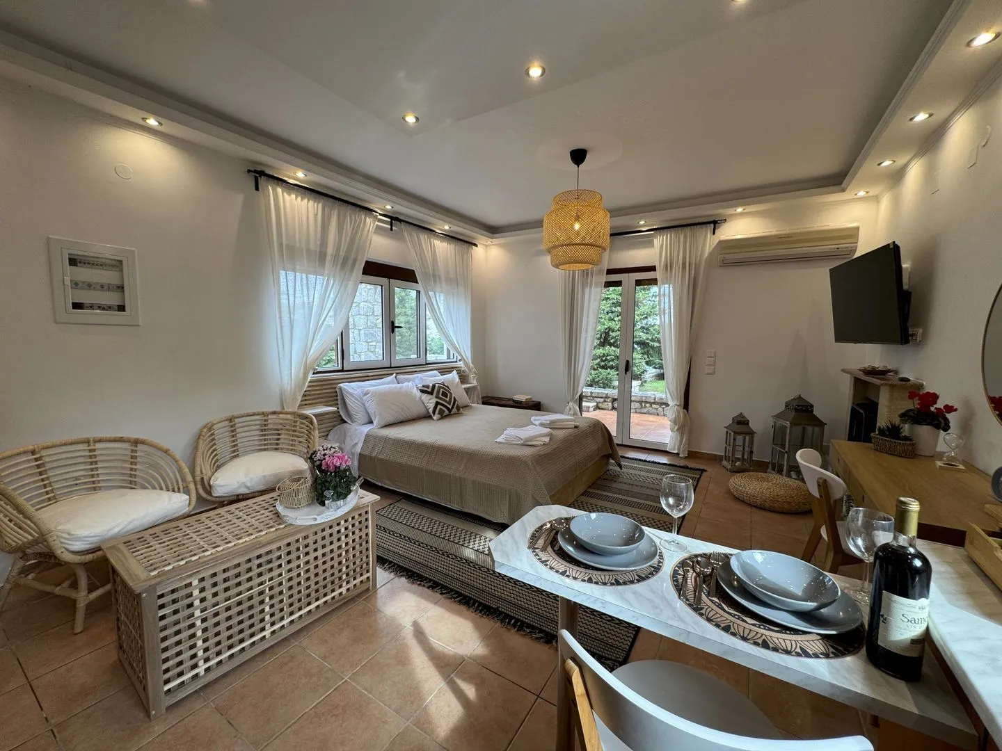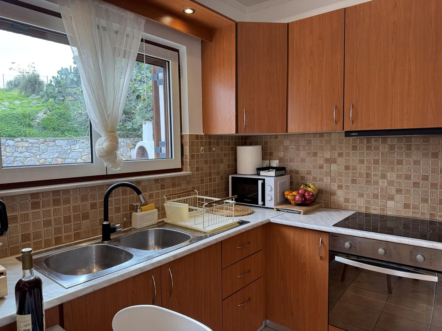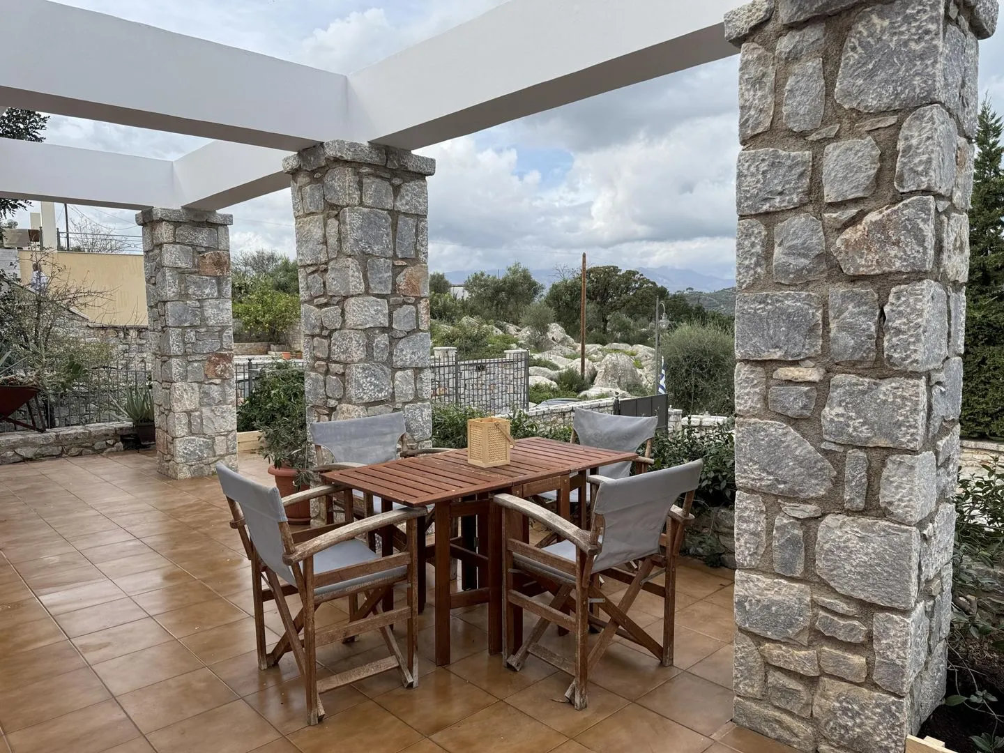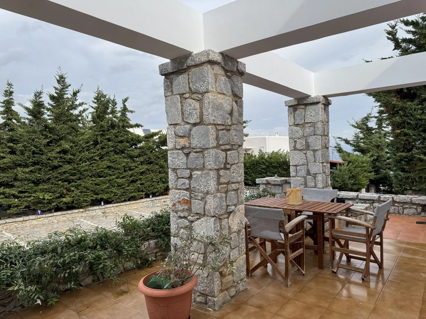 The Jassemi holiday home enjoys an attractive corner location, approximately 20 metres from the pool, picturesquely overlooking the sea on the edge of Mavrovouni, and offers the perfect Mediterranean retreat for your holiday for two. The comfortably furnished house boasts two beautiful terraces: a canvas-covered front terrace and a spacious, secluded rear terrace with a barbecue and traditional farmhouse oven – ideal for balmy summer evenings under the starry sky. Please note that from June 1st to September 1st, a general ban on grilling and open fires applies on site due to the increased risk of wildfires. Inside, guests will find a bright, harmoniously designed living and sleeping area with an open-plan kitchen, bathroom and direct access to both terraces. Modern comfort combines with Mediterranean flair to create an atmosphere where you immediately feel at home.
