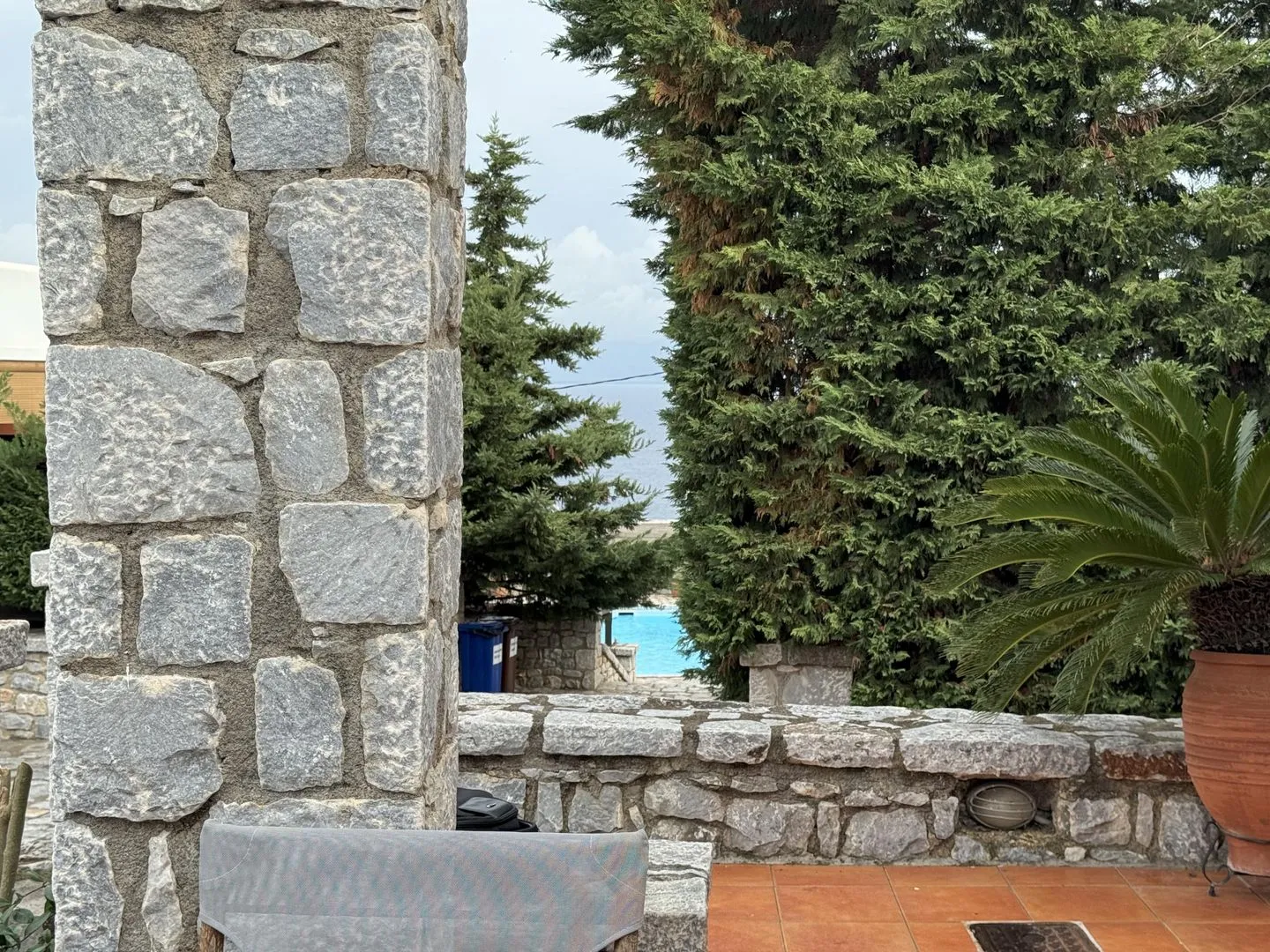 At the front of the complex is the communal pool – a refreshing focal point for carefree holidays. The approx. 50 m² pool (10 × 5 m, 1.20–2 m deep, not heated, open from 1 January to 31 December) is located on a pool terrace and is equipped with sun loungers, parasols and an outdoor shower. From here, there is a sweeping view of the sea and the gently rolling hills on the eastern coast of the Mani region – perfect holiday moments full of tranquillity and panoramic views over the bay of Gythion.