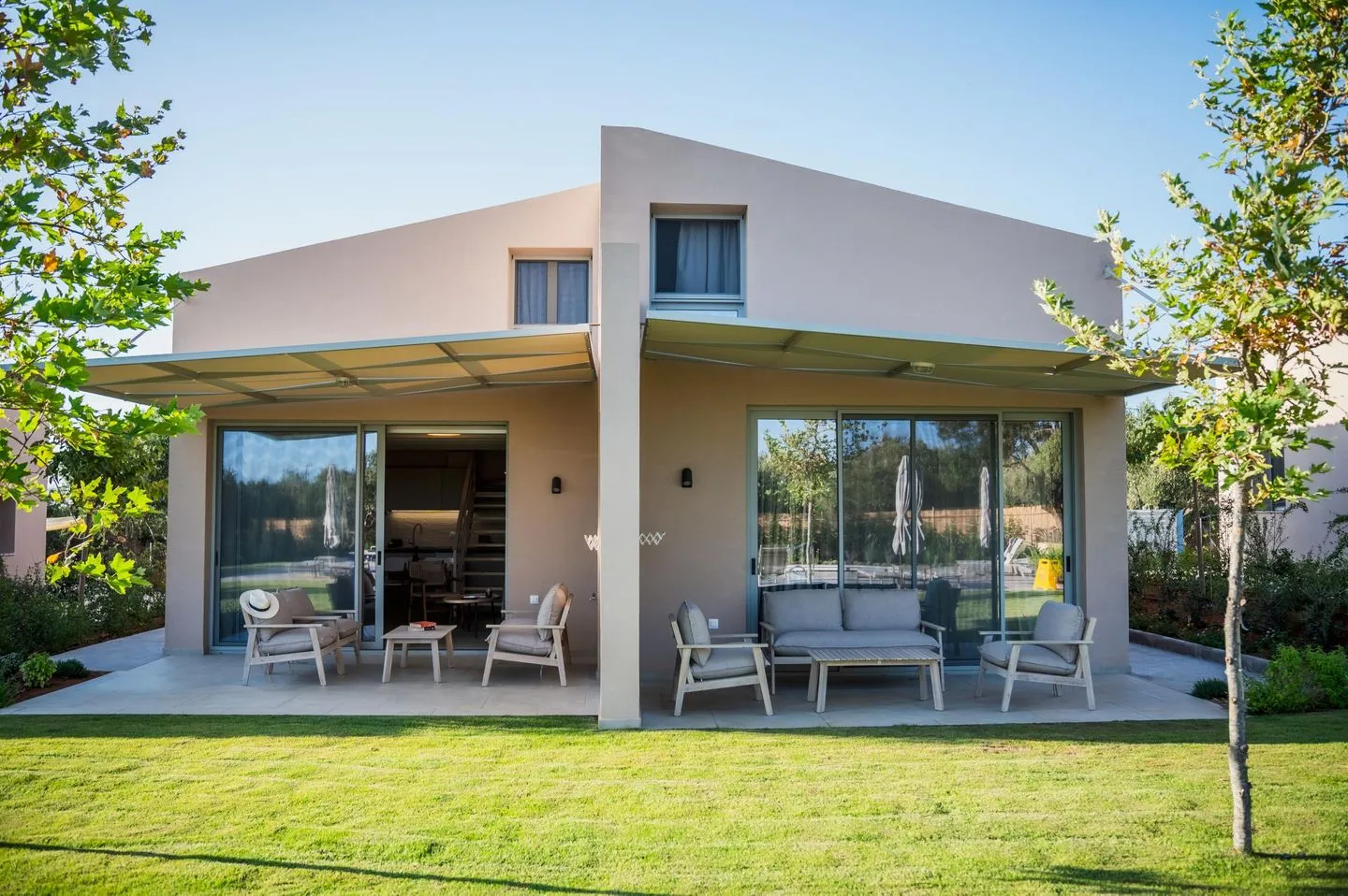 The covered terrace in front of the house offers welcome shade. Two comfortable armchairs and a sofa create an inviting spot for relaxing and unwinding.
