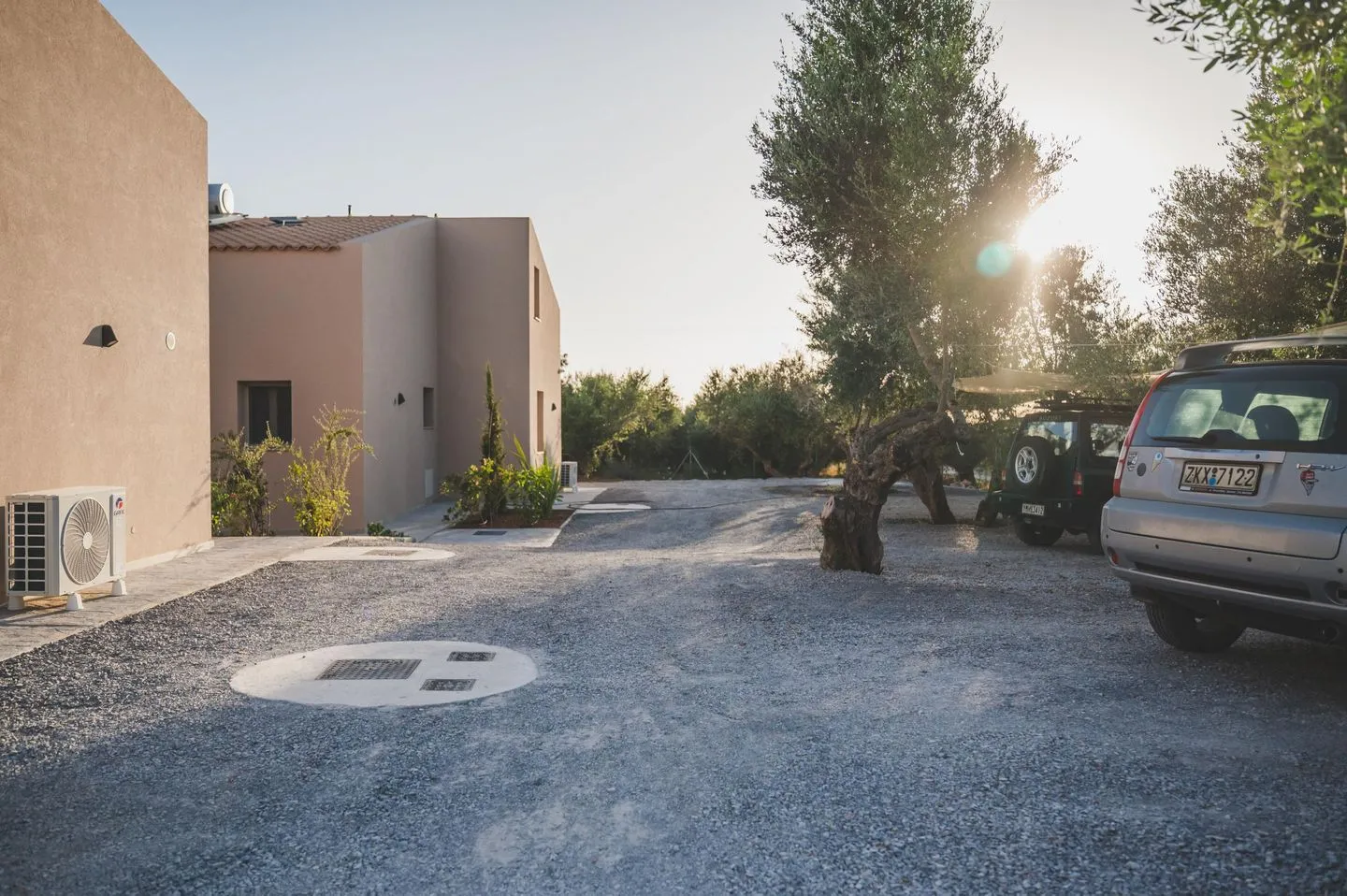 Two old, tall olive trees provide pleasant shade on the small platia in front of the reception building – a welcoming place for social moments and warm summer evenings. Paved paths lead through the blooming Mediterranean garden to the pool terrace, equipped with six large parasols, twelve comfortable loungers, and an outdoor shower. The shared pool (approx. 90 sqm; 10 × 9 m; 1.50 m deep; unheated; in operation 28.03.–15.11.) and the children’s pool (approx. 7 sqm; 2.5 × 2.7 m) promise carefree swimming fun for guests of all ages.