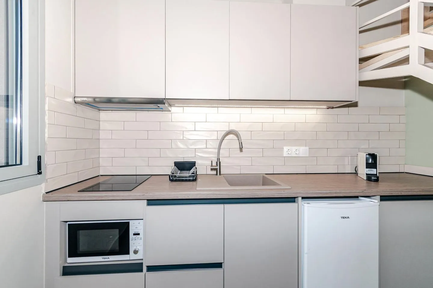 1 open bedroom (upper floor) above the kitchen-diner, 1 double bed (180 cm).