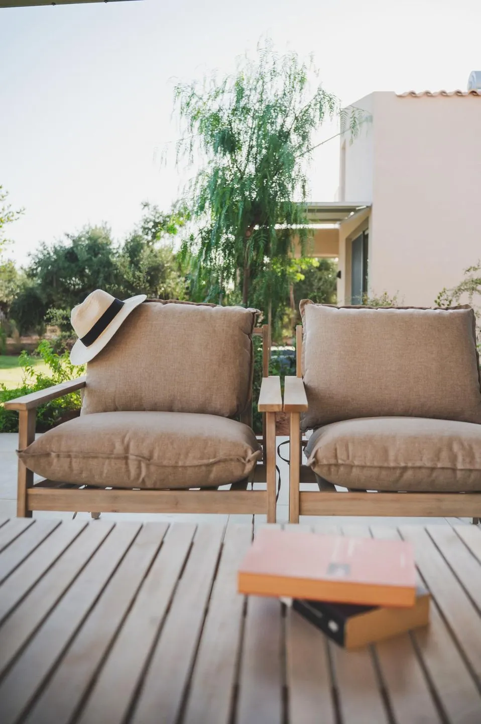 The covered terrace in front of the house offers welcome shade. Two comfortable armchairs and a sofa create an inviting spot for relaxing and unwinding.
